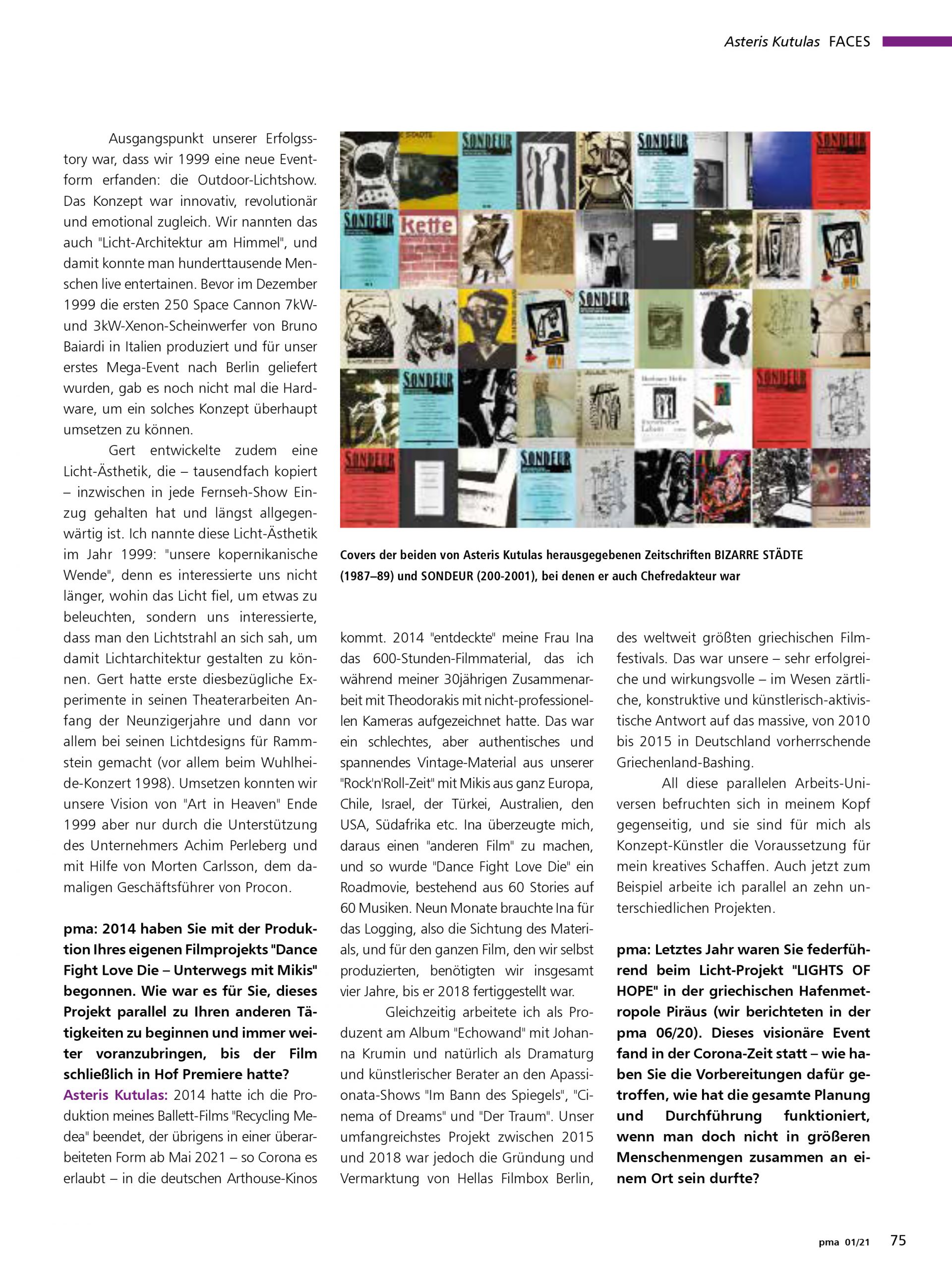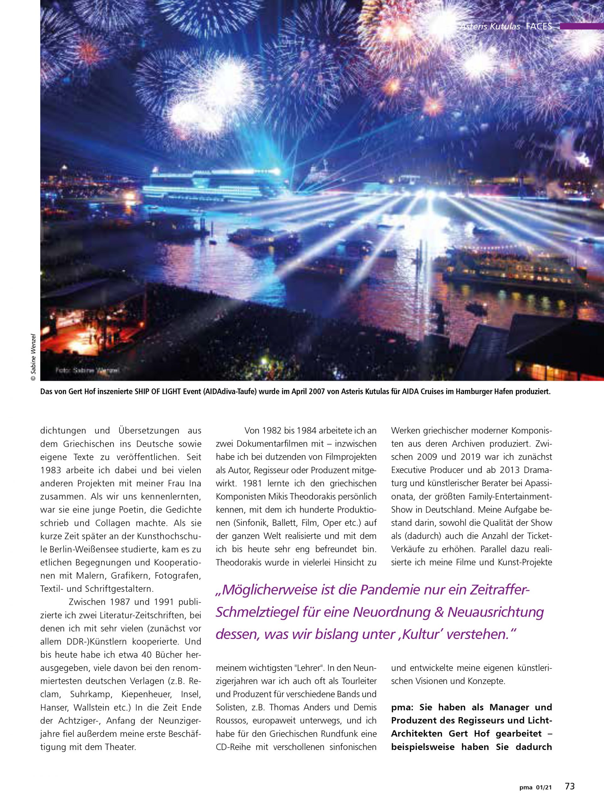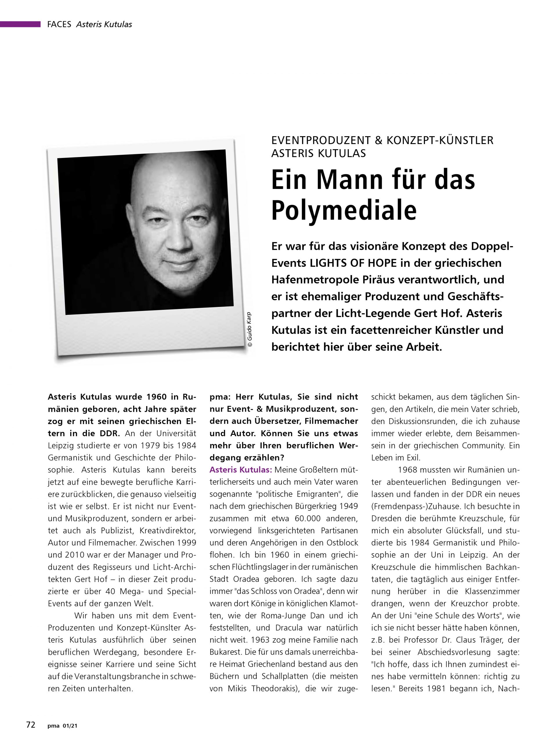 [Er war für das visionäre Konzept des Doppel-Events LIGHTS OF HOPE in der griechischen Hafenmetropole Piräus verantwortlich, und er ist ehemaliger Produzent und Geschäftspartner der Licht-Legende Gert Hof. Asteris Kutulas ist ein facettenreicher Künstler und berichtet hier über seine Arbeit. pma Magazin]