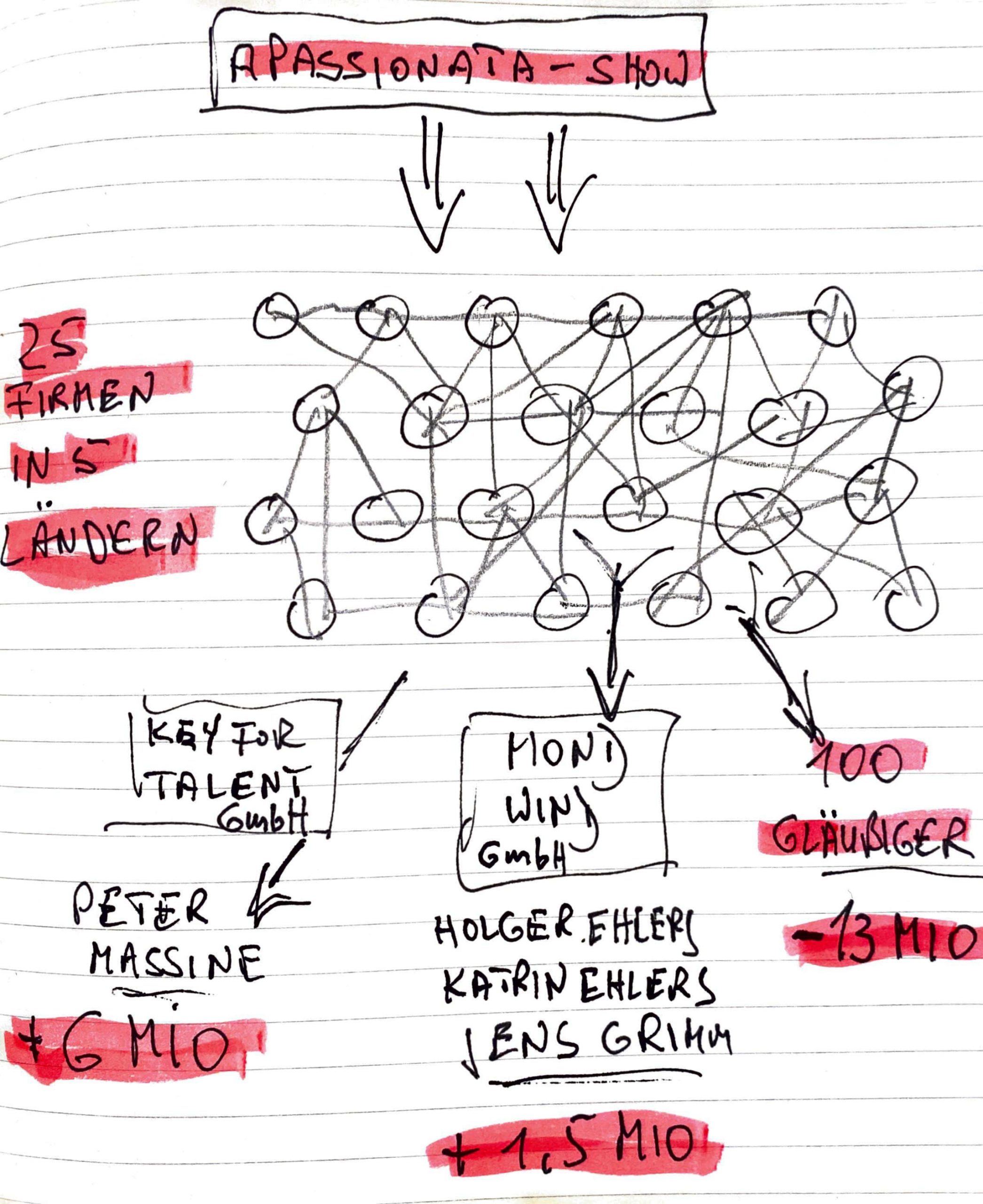 An der Spitze der Firmenpyramide standen Peter Massine und die in Innsbruck (Österreich) angesiedelte „Peter und Karen Massine Privatstiftung“, deren Verbindung zu seinen anderen Firmen er in der Präsentation vom 25.9.2018 mit dem Titel „APASSIONATA Der magische Traum – Darstellung der Rahmenbedingungen für eine Finanzierung“ wie folgt skizzierte: