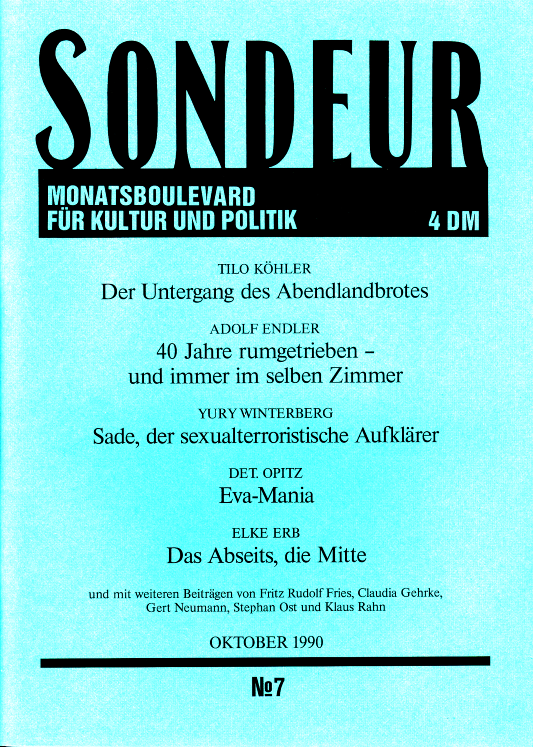 Zugleich kann hiermit der erste vollständige Jahrgang unseres galanten Almanachs durch jedermann besichtigt werden; Anlass auch für eine gelassene Rundschau unsererseits, deren Heiterkeit dem Unernst der Stunde angemessen bleiben soll. Denn SONDEUR stellt mit diesem Heft 12 sein regelmäßiges Erscheinen als Monatszeitschrift ein. Getreu unserer ersten Selbstdefinition als Literatur der k & k (Kutulas & Köhler) waren unsere Intentionen von Beginn an nicht auf expansive, sondern eher untergehende Phänomene gerichtet, denen wir mit „Sondeur“ ein gewiß nicht ungefälliges hinzugesellt zu haben hoffen.